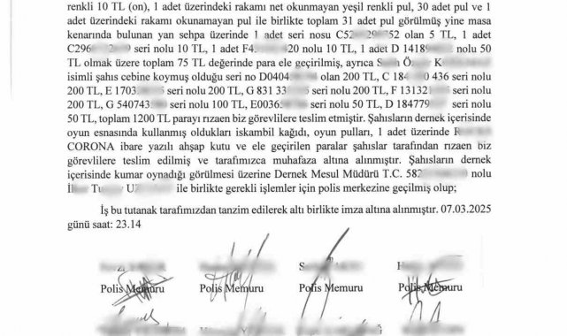 Oyun malzemeleri, "R.C." yazılı ahşap kutu ve paralar muhafaza altına alınırken, dernek mesul müdürü İ.T.U. ve 6'sı polis olmak üzere toplam 15 kişi tutanak imzaladı. Kamera kayıtlarına göre, baskın sırasında S.Ö.K.'nin masadaki parayı cebine koyduğu ve Ö.N.'nin elindeki pulları bıraktığı anlar görüntülere yansıdı.