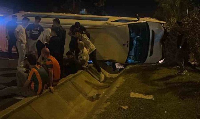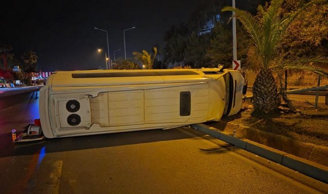 Alanya'da aydınlatma direğine çarpan minibüs devrildi