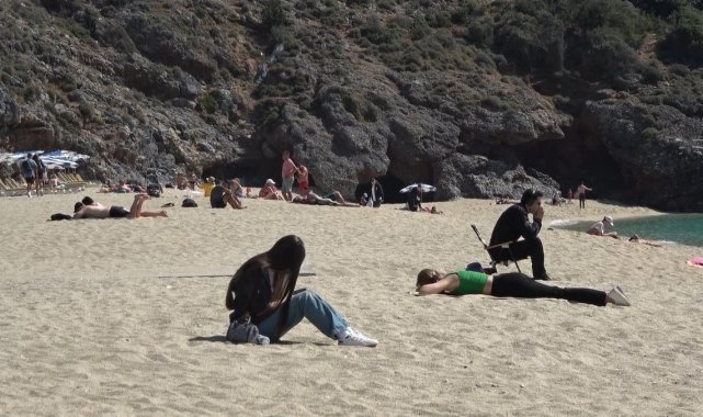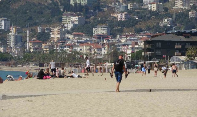 Antalya'nın Alanya ilçesinde hava sıcaklığının 20 dereceye çıktığı Mart ayında yerli ve yabancı turistler dünyaca ünlü Kleopatra plajına indi.