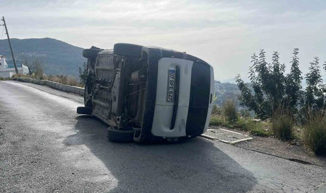 Antalya'nın Alanya ilçesinde kontrolden çıkan hafif ticari araç, önce bordür taşlarına çarptı, ardından çarpmanın etkisiyle devrilen otomobil sürücüsü kazada hafif yaralandı.