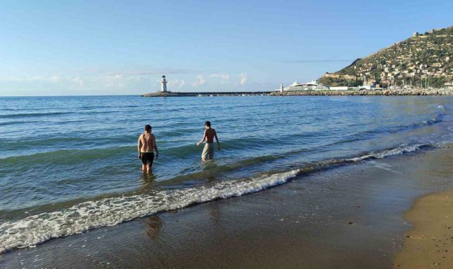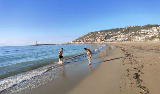 Alanya'da sabahın erken saatlerinde sahile gelen iki arkadaş, bir süre kıyıda vakit geçirdikten sonra denize girme kararı aldı. Erken saatlerinde soğuk havaya aldırış etmeyen gençler, kısa süreli yüzdü. Bir süre denizde kalan gençler, daha sonra sudan çıkarak sahilden ayrıldı.