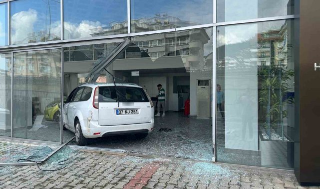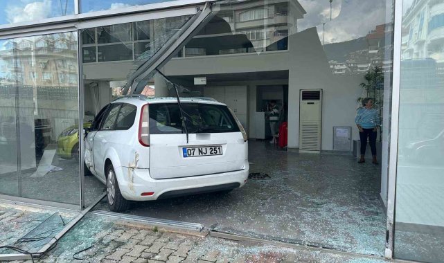 Alanya'da şerit ihlali yapan otomobil showrooma daldı
