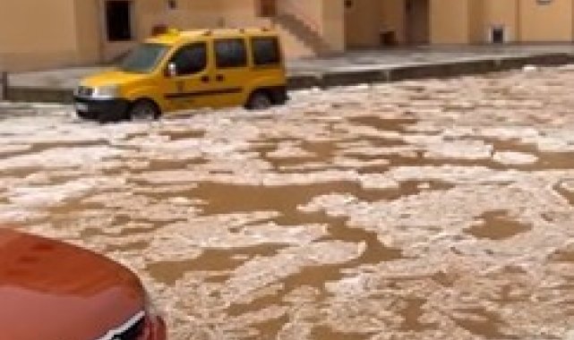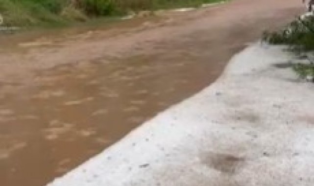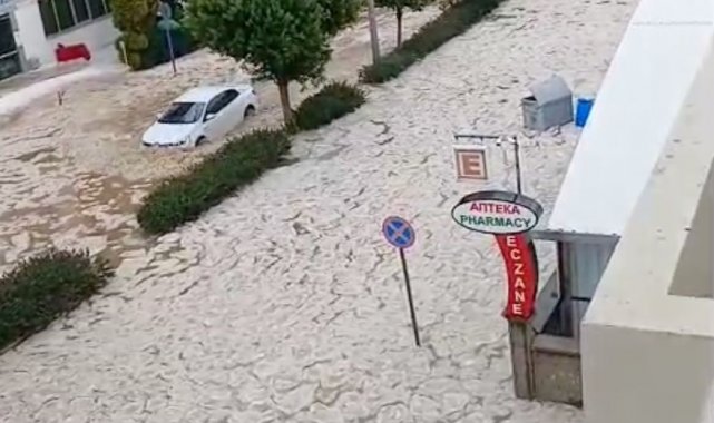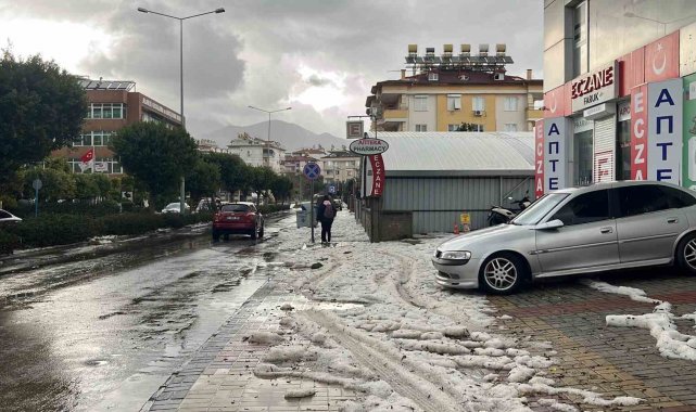 Antalya'nın Alanya ilçesinde öğle saatlerinden itibaren etkili olan sağanak yağış ve dolu sebebiyle sokaklar beyaza büründü yollar göle döndü, araçlar ilerlemekte zorlandı.