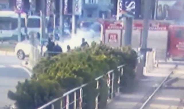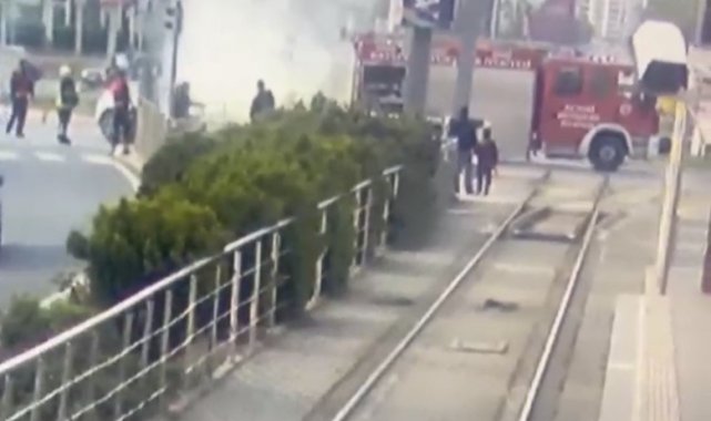 Öte yandan, elektrikli otomobil ışıklarda beklediği sırada çıkan yangın ve ekiplerin yangın battaniyesiyle alevlere müdahale ettiği anlar güvenlik kameraları tarafından anbean kaydedildi.