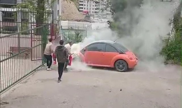 Alev alan otomobile ilk müdahaleyi okul müdürü yaptı