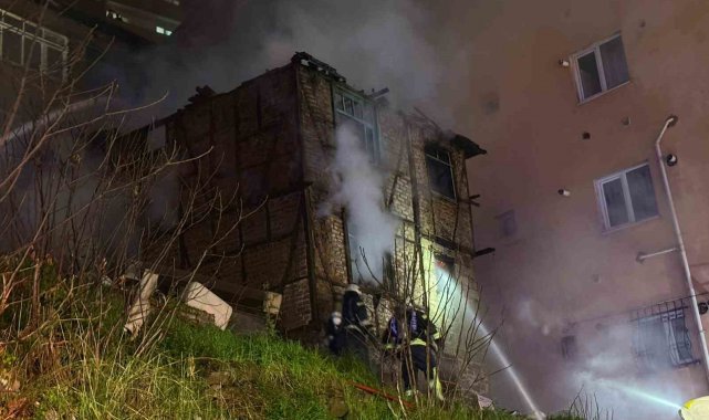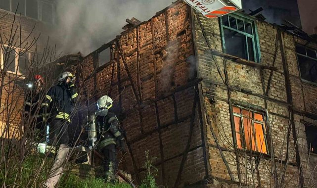 Alev alev yanan iki katlı ahşap metruk bina küle döndü