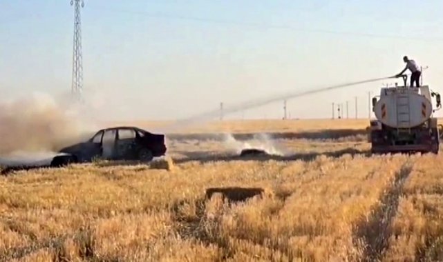 Aksaray'da biçilmiş arpa tarlasında bilinmeyen bir nedenle yanmaya başlayan otomobil kısa sürede alev topuna dönerken, yangın tarlaya da sıçrayınca arazide çok sayıda saman balyası yandı.
