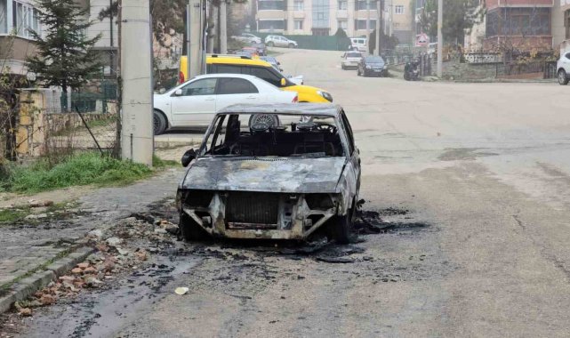 Karabük'ün Safranbolu ilçesinde park halindeyken alev alan ve tamamen yanarak kullanılmaz hale gelen otomobilden geriye yalnızca demir yığını kaldı.