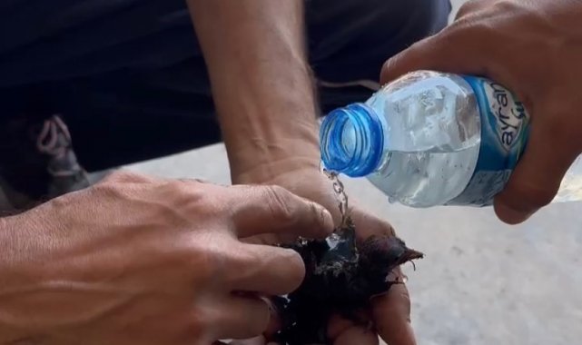 Hatay'da çıkan yangında alevler içinde kalan yavru serçe, itfaiye ekipleri tarafından kurtarılarak can suyu verildi.