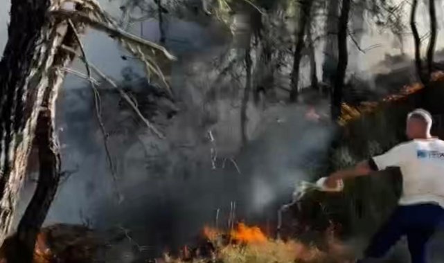 Sakarya'nın Geyve ilçesinde orman yangınında bir vatandaş, çukurdan aldığı suyu pet şişeyle taşıyarak yangına müdahale etti.