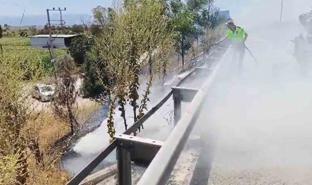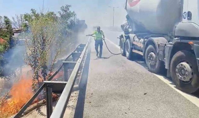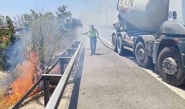 Aydın-Denizli Otobanı Çevreyolu kenarında çıkan ot yangınına ilk müdahaleyi Aydın İl Emniyet Müdürlüğü Bölge Trafik Denetleme Şube Müdürlüğü ekipleri yoldan geçen beton mikserini durdurarak yaptı.