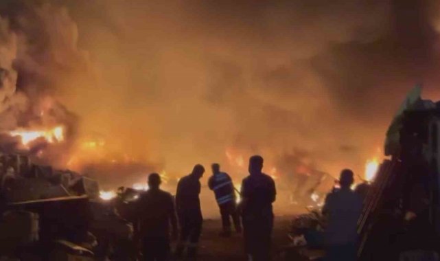 Alevlere teslim olan hurdalık alanda çıkan yangın geceyi aydınlattı