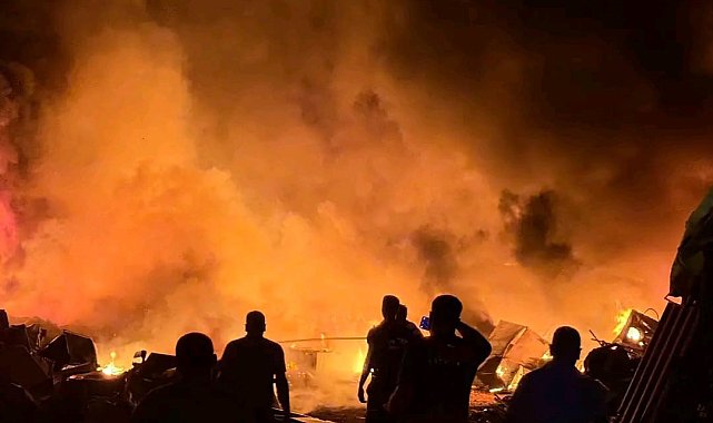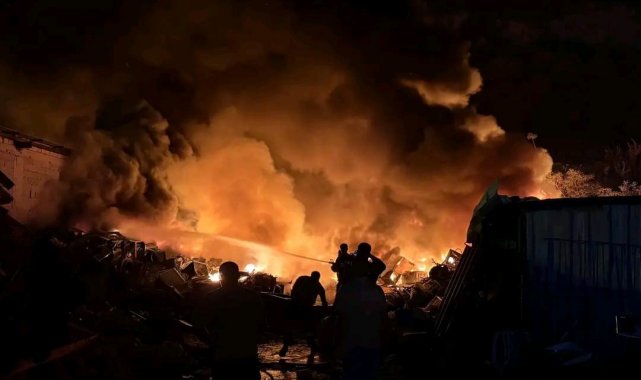 Hatay'ın Antakya ilçesinde alevlere teslim olan hurdalık alanda çıkan yangını geceyi aydınlatırken itfaiye ekipleri tarafından söndürüldü.