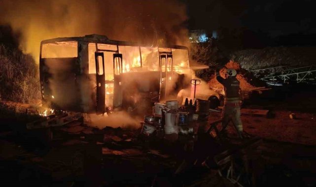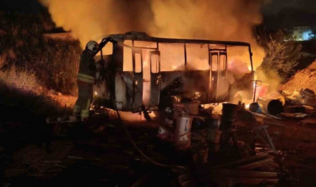 Hatay'da şantiye alanında alevlere teslim olan konteyner ve minibüs yanarak kullanılmaz hale geldi.