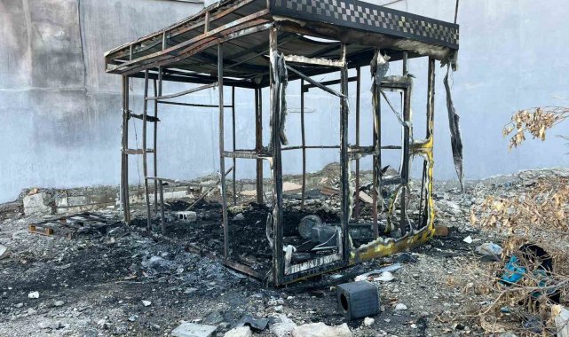 Hatay'da alevlere teslim olarak yanan taksi kulübesi yanarak kullanılmaz hale geldi.