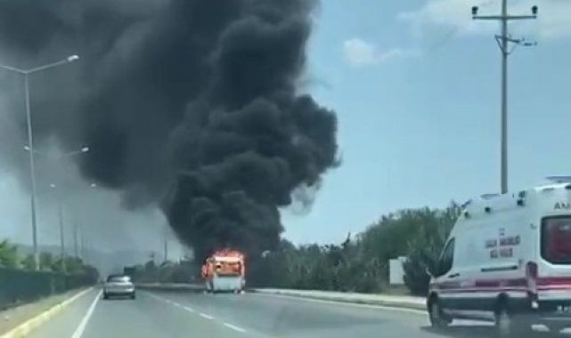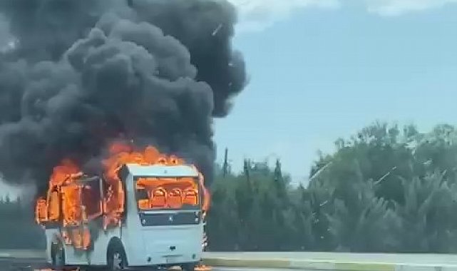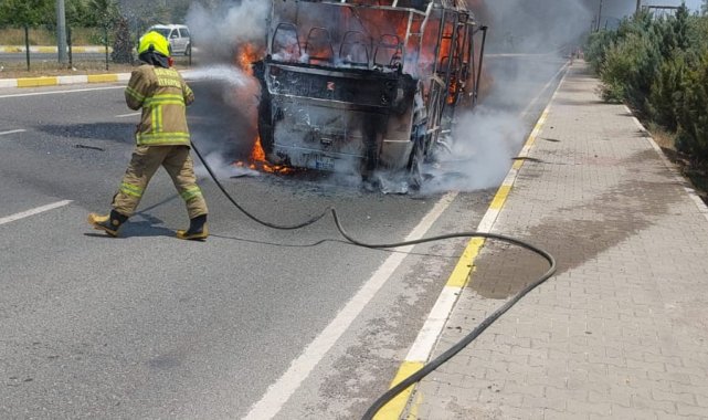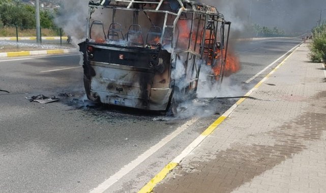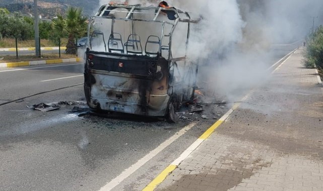 Balıkesir'in Edremit ilçesi Narlı Mahallesi'nde seyir halindeyken alevlere teslim olan yolcu minibüsü kullanılamaz hale geldi.