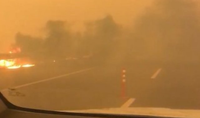 Kayda alınan bir görüntüde, ekibin araçla alevlerin ve yoğun dumanın arasında kaldığı anlar yer alıyor. Görüntülerde alevlerin yola kadar indiği ve dumandan görüş mesafesinin neredeyse sıfıra düştüğü görülürken, araçtaki bir kişinin "Abi çıkmamız lazım, ortada kaldık. Allah'ım, sen yardım et, Ya Rabbim. Allah'ım sen büyüksün" şeklindeki paniği kayda yansıyor.