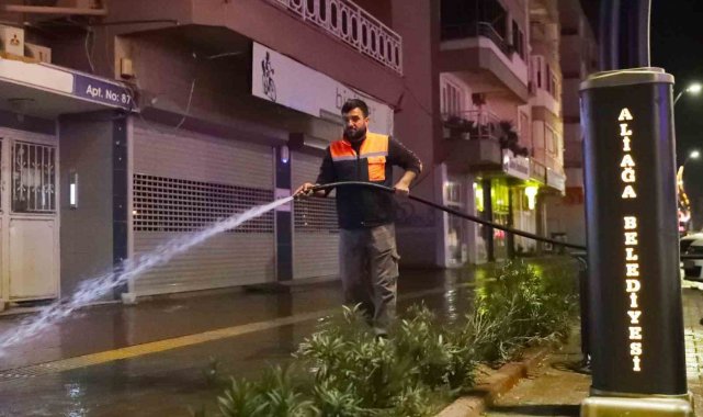 Temizlik İşleri Müdürlüğü'ne bağlı ekipler sabaha kadar yaptıkları çalışmalarla Aliağa'yı bayrama hazır hale getirdi. Özel sulama araçlarıyla cadde, sokak ve meydanlar yıkandı, ardından dezenfeksiyon çalışmaları gerçekleştirildi.