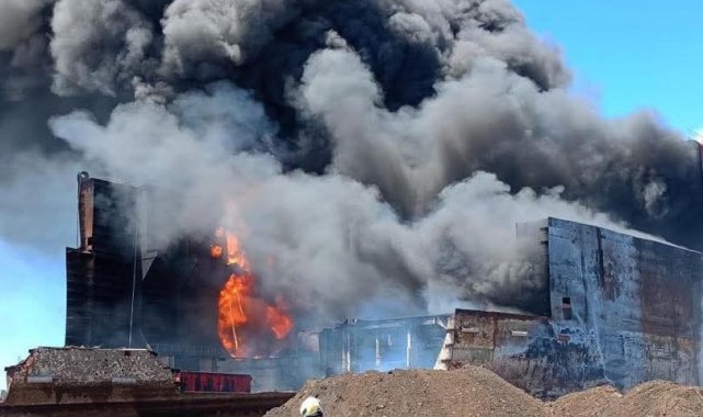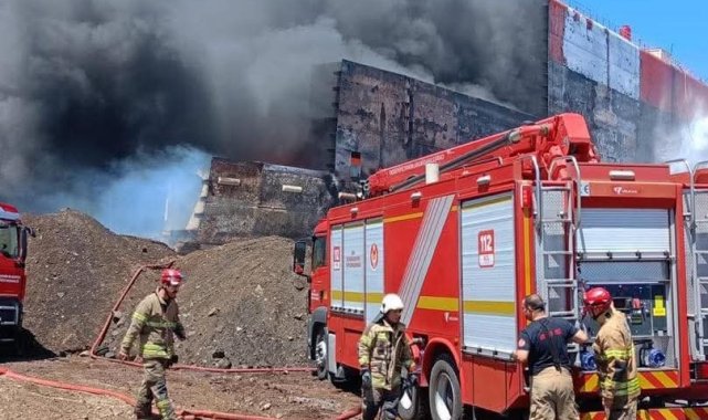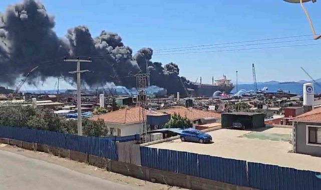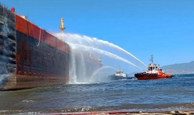 İzmir'in Aliağa ilçesinde hurda gemilerinin geri dönüştürüldüğü gemi söküm bölgesinde, Libya'dan gelen Sloug adlı gemide söküm çalışmaları sırasında başlayan yangın devam ediyor.