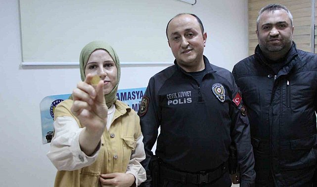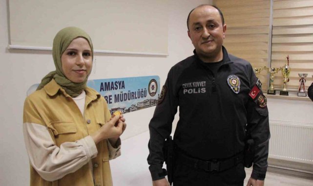 Amasya'da alışveriş dönüşü boynunda asılı yarım altını kaybettiğini fark ederek umutsuz bir şekilde polisi arayıp yardım isteyen genç kadın, karşısındaki görevlinin 'altının emin ellerde' sözüyle büyük sevinç yaşadı. Ailesiyle sokakta gezerken genç kızın altını düşürdüğü dükkanın önüne 40 dakika sonra tesadüfen gelen polis memuru, yerde bulduğu altının sahibine ulaşmasını sağladı. O anlar çevredeki güvenlik kamerasına yansıdı.