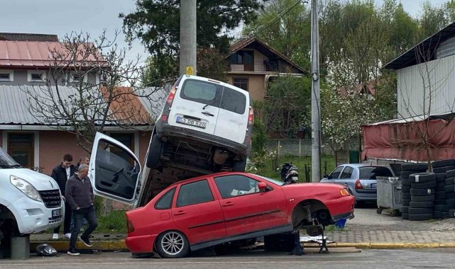 Kocaeli'de hafif ticari araçla seyir halinde olan alkollü sürücü, oto tamirciye tamir için bırakılan otomobilin üstüne uçtu. Kazada 3 kişi yaralanırken, araçlar kullanılamaz hale geldi.
