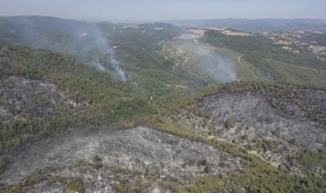 Balıkesir'in Altıeylül ilçesinde gece müdahalesi yapılan yangına sabah saatlerinde havadan müdahale başladı. Yangın alanı havadan görüntülendi.