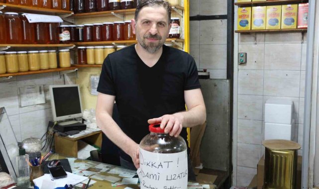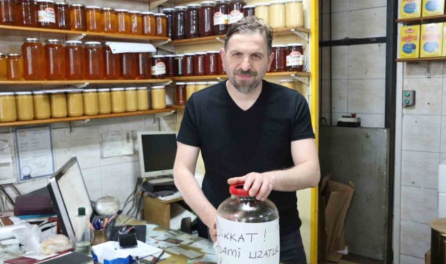 Rize'de deli balın kontrolsüz tüketimine dikkat çekmek isteyen esnafın bal kavanozuna yazdığı 'Adami uzatur' ifadeleri görenlerin ilgisini çekti.