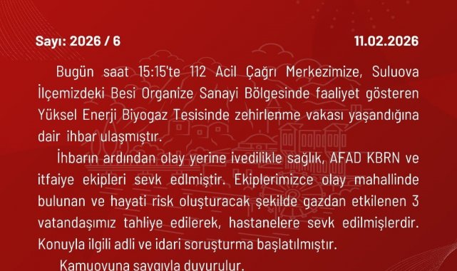 Valilikten yapılan açıklamada, "Suluova ilçemizdeki Besi Organize Sanayi Bölgesi'nde faaliyet gösteren Yüksel Enerji Biyogaz Tesisi'nde zehirlenme vakası yaşandığına dair ihbar ulaşmıştır. İhbarın ardından olay yerine ivedilikle sağlık, AFAD, KBRN ve itfaiye ekipleri sevk edilmiştir. Ekiplerimizce olay mahallinde bulunan hayati risk oluşturacak şekilde gazdan etkilenen 3 vatandaşımız tahliye edilerek hastanelerek sevk edilmişlerdir. Konuyla ilgili adli ve idari soruşturma başlatılmıştır" denildi.