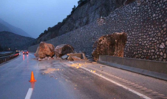 Amasya'da dağdan kopan dev kaya parçaları yola düştü. Olay sırasında yolda araç ya da yaya bulunmaması muhtemel bir faciayı önledi.