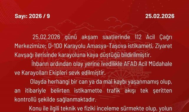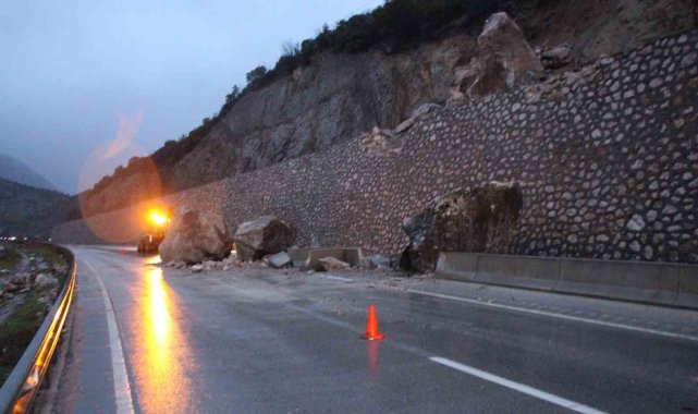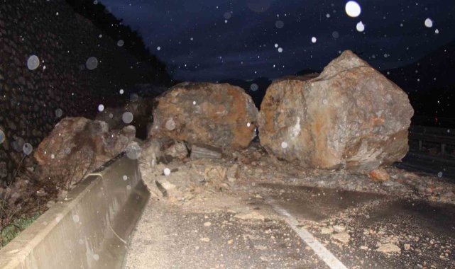 Edinilen bilgiye göre, gün boyu aralıklarla sürüp akşam saatlerine doğru artan yağışında etkisiyle Amasya-Taşova karayolu 5. kilometresi civarında dağdan kopan dev kaya parçaları yola yuvarlandı. O sırada yolda araç ya da yaya bulunmaması muhtemel bir faciayı önledi.