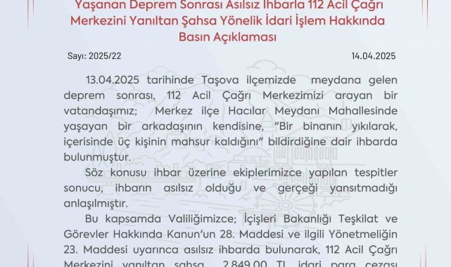 Amasya Valiliği tarafından yapılan açıklamada, "13.04.2025 tarihinde Taşova ilçemizde meydana gelen deprem sonrası 112 Acil Çağrı Merkezimizi arayan bir vatandaşımız merkez ilçe Hacılar Meydanı Mahallesi'nde yaşayan bir arkadaşının kendisine 'bir binanın yıkılarak içerisinde üç kişinin mahsur kaldığını' bildirdiğine dair ihbarda bulunmuştur. Söz konusu ihbar üzerine ekiplerimizce yapılan tespitler sonucu ihbarın asılsız olduğu ve gerçeği yansıtmadığı anlaşılmıştır. Bu kapsamda Valiliğimizce İçişleri Bakanlığı Teşkilat ve Görevler Hakkında Kanun'un 28. maddesi ve ilgili yönetmeliğin 23. maddesi uyarınca asılsız ihbarda bulunarak 112 Acil Çağrı Merkezi'ni yanıltan şahsa 2 bin 849 TL idari para cezası uygulanmıştır" denildi.