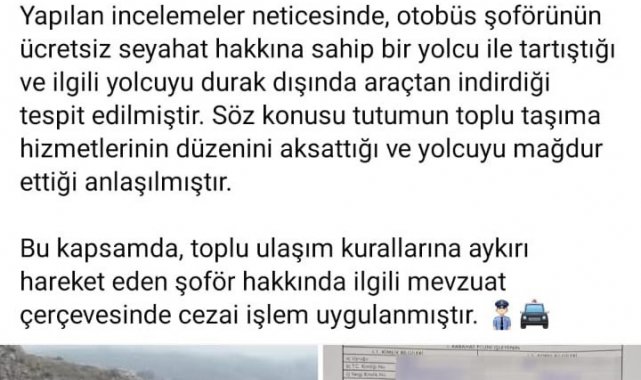 Sürücünün yolcuyu araçtan indirdiği olayın görüntülerinin sosyal medyada paylaşılması üzerine Amasya Belediyesi zabıta ekipleri harekete geçti. Yapılan açıklamada, "İncelemeler neticesinde otobüs şoförünün ücretsiz seyahat hakkına sahip bir yolcu ile tartıştığı ve ilgili yolcuyu durak dışında araçtan indirdiği tespit edilmiştir. Söz konusu tutumun toplu taşıma hizmetlerinin düzenini aksattığı ve yolcuyu mağdur ettiği anlaşılmıştır. Bu kapsamda, toplu ulaşım kurallarına aykırı hareket eden şoför hakkında ilgili mevzuat çerçevesinde cezai işlem uygulanmıştır" ifadelerine yer verildi.