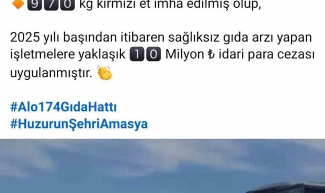 Amasya Valiliği, denetimlerin ve etlerin imha görüntülerini "Halkımızın sağlığıyla oynayanlara müsaade etmiyoruz" notuyla paylaştı. Paylaşımın devamında "İl Tarım ve Orman Müdürlüğümüz tarafından yapılan denetimlerde sağlıksız olduğu tespit edilen 415 kg süt ürünü, 305 litre sahte zeytinyağı, 970 kg kırmızı et imha edilmiş olup, 2025 yılı başından itibaren sağlıksız gıda arzı yapan işletmelere yaklaşık 10 Milyon TL idari para cezası uygulanmıştır" açıklamasında bulunuldu.