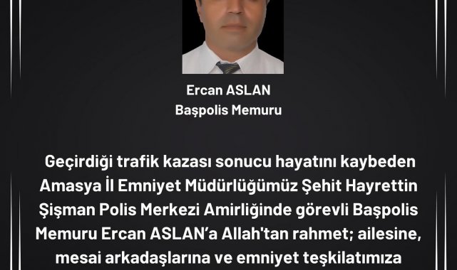 Amasya merkez Kapıkaya köyü civarında yaşanan kazanın ardından Amasya Üniversitesi Eğitim ve Araştırma Hastanesine kaldırılan Aslan (52), yapılan tüm müdahalelere rağmen kurtarılamadı. Amasya Valiliği, Amasya Emniyet Müdürlüğü Şehit Hayrettin Şişman Polis Merkezinde görevli başpolis Ercan Aslan için başsağlığı mesajı yayınladı.