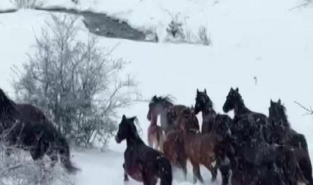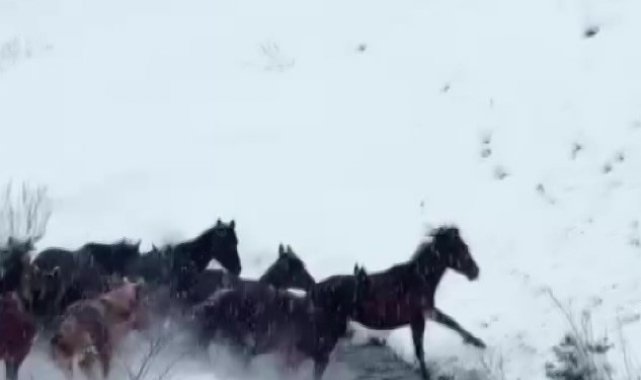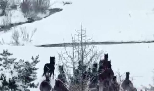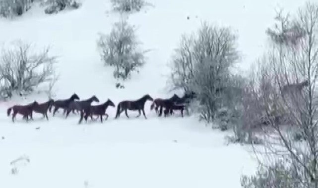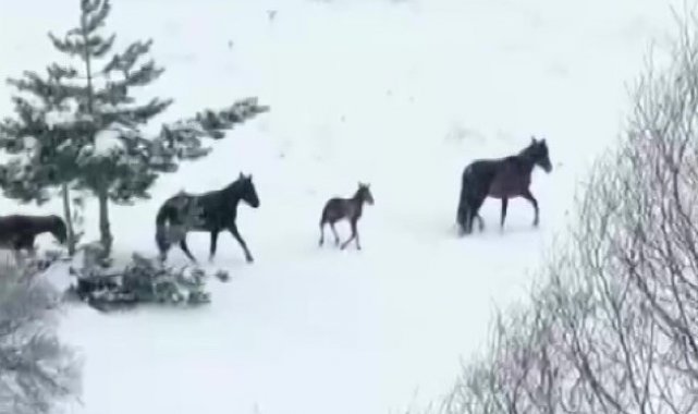 Dağın farklı kesimlerinde yaşam alanı bulan ve sayıları tam olarak bilinmeyen yılkı atları, 20'den fazla sayıdaki gruplar halinde karla kaplanan bölgelerde yiyecek ararken görüntülendi. Dört nala koşan sürüde yeni doğan taylarında bulunduğu görüldü.