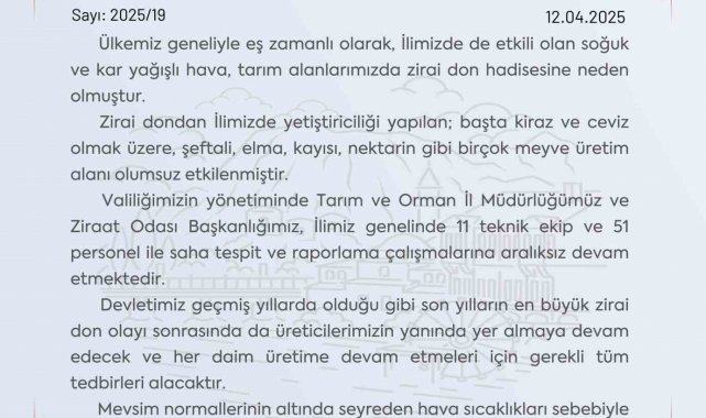 Amasya Valiliği, "Zirai dondan ilimizde yetiştiriciliği yapılan başta kiraz ve ceviz olmak üzere şeftali, elma, kayısı, nektarin gibi birçok meyve üretim alanı etkilenmiştir" açıklamasında bulundu. Amasya Valisi Önder Bakan, AK Parti İl Başkanı Galip Uzun ve Amasya Ziraat Odası Başkanı Mustafa Cebeci zarar gören köylerde incelemede bulundu. Hava sıcaklığının gece -7'leri geçtiğine dikkat çeken Amasya İl Tarım ve Orman Müdürü Gürol Çetin, bunun son 21 yılda Nisan ayında kaydedilen en düşük sıcaklık rekoru olarak kayıtlara geçtiğine dikkat çekti.