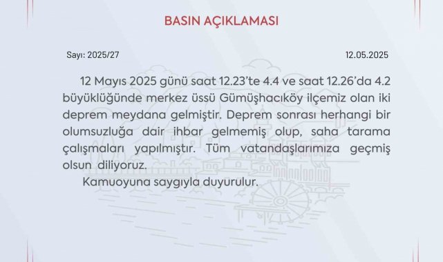 "12 Mayıs 2025 günü saat 12.23'te 4.4 ve saat 12.26'da 4.2 büyüklüğünde merkez üssü Gümüşhacıköy ilçemiz olan iki deprem meydana gelmiştir. Deprem sonrası herhangi bir olumsuzluğa dair ihbar gelmemiş olup saha tarama çalışmaları yapılmıştır. Tüm vatandaşlarımıza geçmiş olsun diliyoruz."