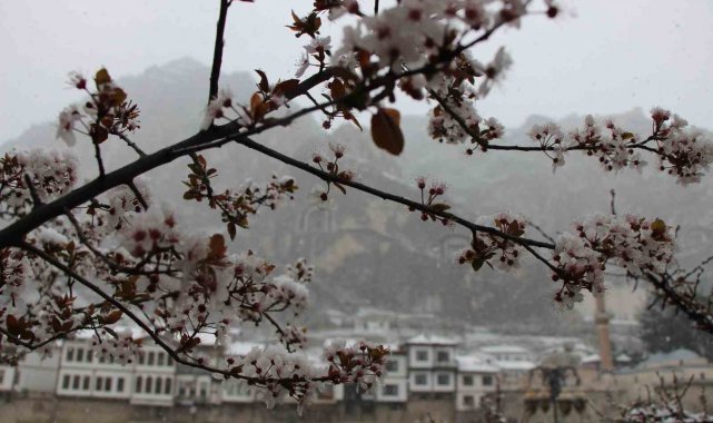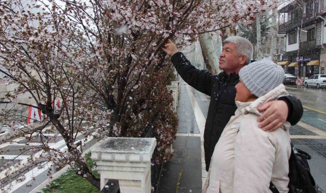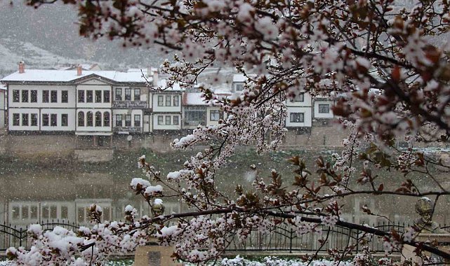 Amasya'ya mart ayında erken açan ağaçların çiçekleri karla kaplandı.