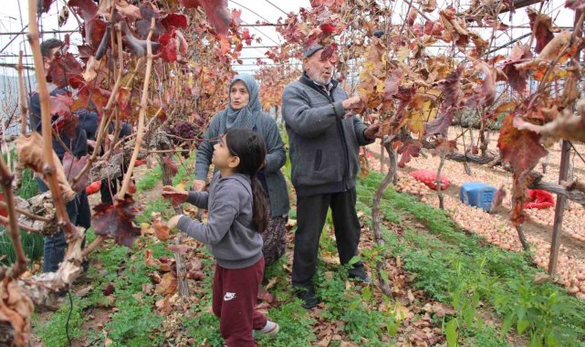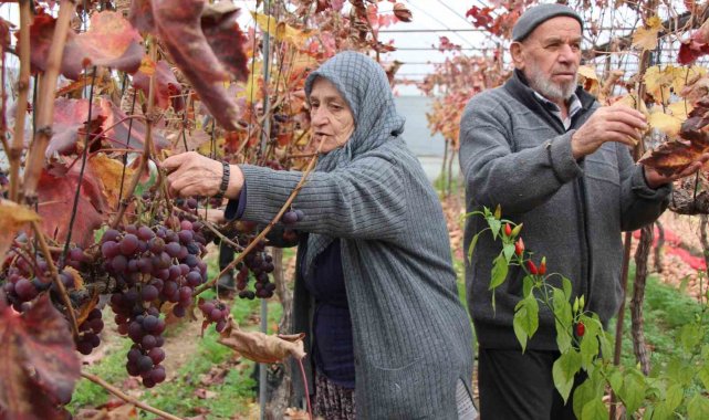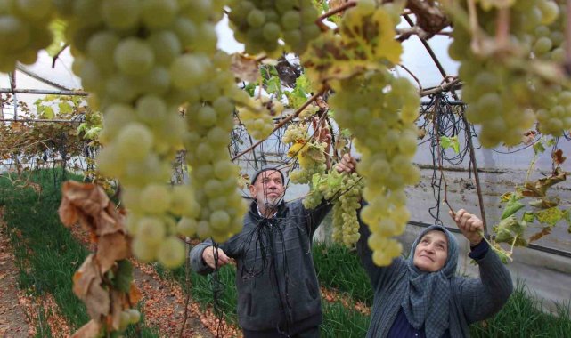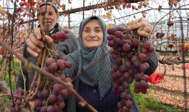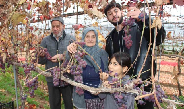 Amasya'da yaşayan Feruziye nine, serasında yetiştirdiği rengarenk üzümleri aralık ayında bile hasat ediyor. Kancı ailesi, haziran ve aralık ayları arasında dalından koparılan üzümleri pazarda kilosu 100 TL'ye varan fiyatlarda satıp kazancını artırdı.