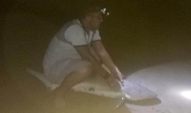 Mersin'in önemli turizm bölgelerinden Taşucu'nda kıyıdan amatör olarak avlanan Durmuş Ali Kesikbaş'ın oltasına bir gecede 2 köpek balığı takıldı. Oltayı çektiğinde ilk köpek balığını fark eden Keskin'in heyacanlı anları cep telefonu kamerasına yansıdı.