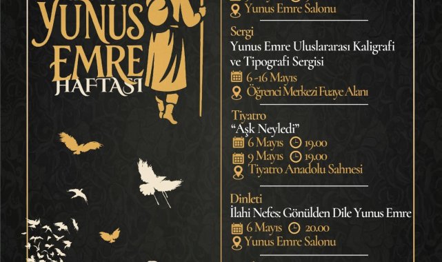 Anadolu Üniversitesi, Türk düşünce ve gönül dünyasının öncülerinden Yunus Emre'yi anmak için 5-11 Mayıs tarihleri arasında dolu dolu bir etkinlik programı sunacak.