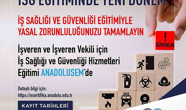 "ANADOLUSEM'in düzenlediği işveren veya işveren vekilleri için iş sağlığı ve güvenliği eğitim programının ders içeriklerini güncel mevzuata göre yeniliyoruz. Bu kapsamda hazırladığımız ders kitabımızı ve diğer öğrenme malzemelerimizi güncel gelişmelere ve mevzuata göre yenileyerek öğrencilerimizin karşısına zengin içeriklerle çıkmaya hazırlanıyoruz. Program kayıtları 3 Şubat 2025'te başlayacak ve 28 Şubat 2025'e kadar devam edecek. Programa katılmak isteyenlerin 18 yaşını doldurmuş olmaları yeterli. Herhangi bir diploma şartı aranmayan eğitimlere başvurular, https://esertifika.anadolu.edu.tr adresi üzerinden gerçekleştirilebilecek. Eğitim sonunda başarılı olan katılımcılar, 'İş Sağlığı ve Güvenliği Hizmetlerinin Yürütümüne İlişkin İşveren veya İşveren Vekili Eğitimi Tamamlama Belgesi' almaya hak kazanacak. Bu belgeyle işverenler veya vekillerinin İSG-KÂTİP sistemine elektronik kayıtları yapılacak. Bu kişiler iş sağlığı ve güvenliği hizmetlerini profesyonel desteğe ihtiyaç duymadan kendileri yürütebilecek. Öğrencilerimizi bütün aşamalarda SMS ve e-posta yoluyla bilgilendireceğiz. Sürekli Eğitim Merkezimiz, yalnızca İSG alanında değil, Çalışma ve Sosyal Güvenlik Bakanlığı, Gençlik ve Spor Bakanlığı, Ticaret Bakanlığı ve TAB Gıda Grubu gibi kamu ve özel sektör kuruluşlarıyla yaptığı iş birliği sayesinde bireylerin ve kurumların hizmet içi eğitim ihtiyaçlarına yönelik çözümler üretmeye devam ediyor."