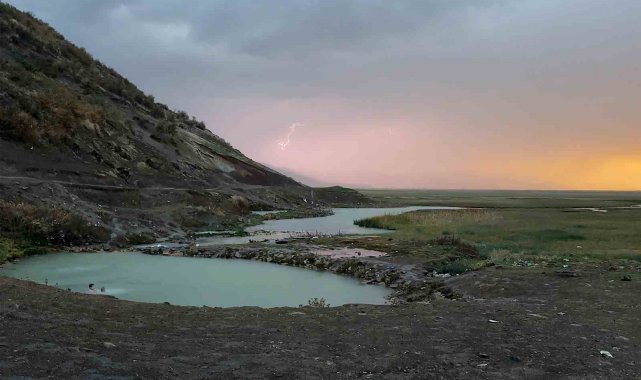 Aniden bastıran yağışla birlikte art arda çakan şimşekler, kaplıcanın sıcak suyunda bulunan vatandaşları tedirgin etti. Kısa süreli yaşanan panik sonrası vatandaşlar güvenli alanlara yöneldi. Doğa gözlemcisi Dr. Cihan Önen, etkileyici doğa olayını anlık olarak görüntüledi.