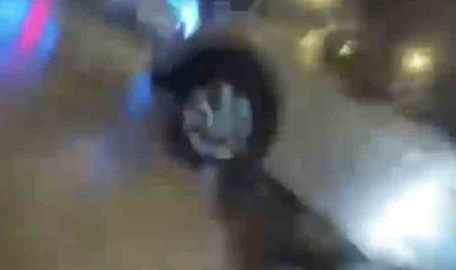 Kask kamerası görüntülerinde, cipin aniden yola çıkması, yağışın etkisiyle motosiklet sürücüsünün kontrolü kaybettiği ve panik anları yer alıyor.