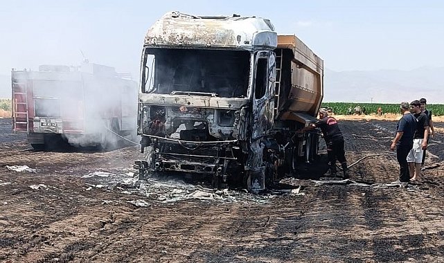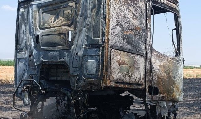 Kahramanmaraş'ta çıkan anız yangınında bir tır kullanılamaz hale geldi.