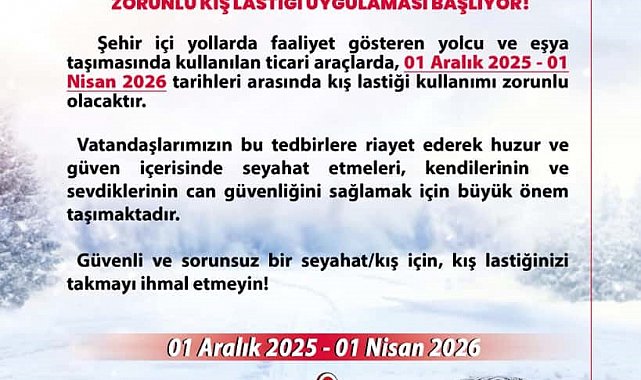 Ankara'da zorunlu kış lastiği uygulaması başlıyor. Şehir içi yollarda faaliyet gösteren yolcu ve eşya taşımasında kullanılan ticari araçlarda 1 Aralık 2025-1 Nisan 2026 tarihleri arasında kış lastiği kullanımı zorunlu olacak. Valiliğin sosyal medya hesabından yapılan paylaşımda, "Vatandaşlarımızın bu tedbirlere riayet ederek huzur ve güven içerisinde seyahat etmeleri, kendilerinin ve sevdiklerinin can güvenliğini sağlamak için büyük önem taşımaktadır. Güvenli ve sorunsuz bir seyahat/kış için kış lastiğinizi takmayı ihmal etmeyin" denildi.