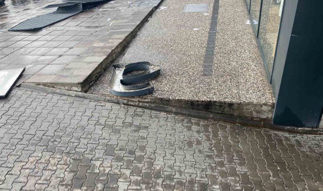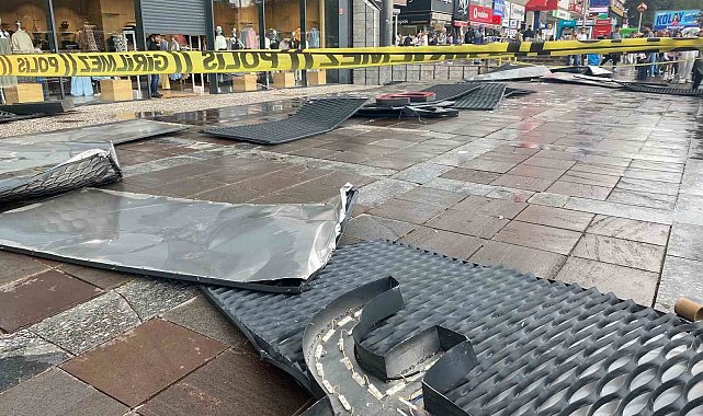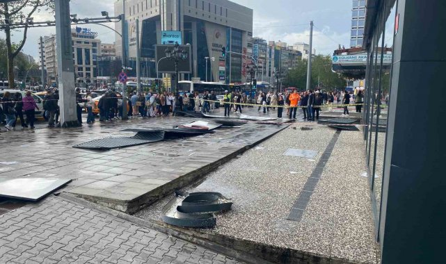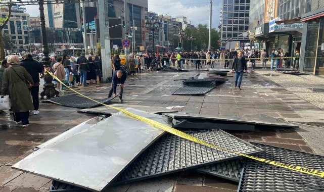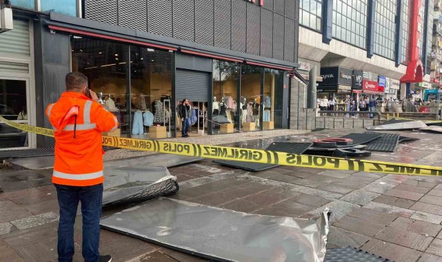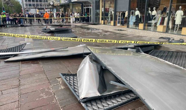 Ankara'da etkili olan fırtına Kızılay'da bulunan bir mağazanın tabelasını caddeye savurdu.