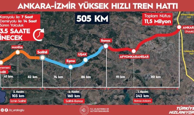 Ankara-İzmir hızlı tren projesinin tamamlanmasıyla mevcut demir yolu bağlantısıyla 824 kilometre olan mesafenin 624 kilometreye ineceğine dikkati çeken Bakan Uraloğlu, "Ankara-İzmir arası hat uzunluğu 624 kilometre olacak. Ancak bizim çalışmalarımız Polatlı'ya kadar mevcut olan hızlı tren hattından sonra başladığı için Ankara-İzmir Yüksek Hızlı Tren hattı kapsamında Ankara-Banaz, Banaz-Salihli ve Salihli-İzmir kesimleriyle toplam 505 kilometre uzunluğunda bir prestij projesi inşa ediyoruz" ifadelerini kullandı.
