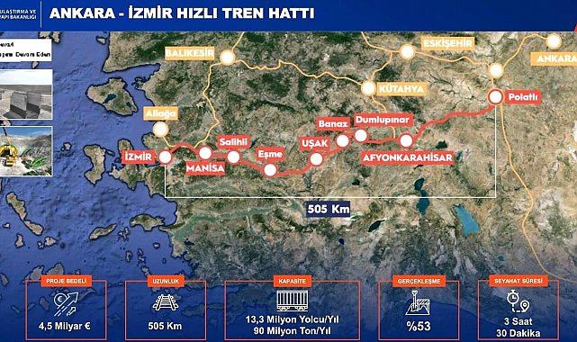 Projenin öne çıkan detayları şöyle; Ankara-İzmir arası seyahat süresi 3 saat 30 dakikaya düşecek. Hattın yıllık 13,3 milyon yolcu ve 90 milyon ton yük taşıma kapasitesine ulaşması hedefleniyor. Çalışmalarda şu ana kadar yüzde 53 fiziksel gerçekleşme sağlandı. Toplam 4,5 milyar avroluk yatırım, bölgenin ulaşım altyapısını modern standartlara kavuşturacak.