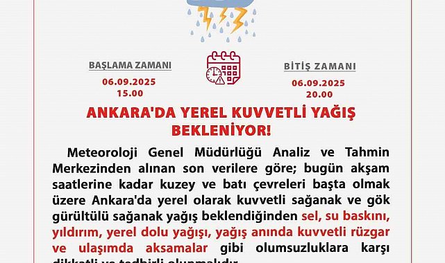 Ankara Valiliği yerel kuvvetli yağış beklendiğini belirterek uyarıda bulundu.